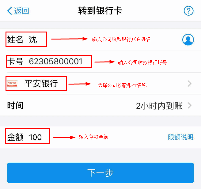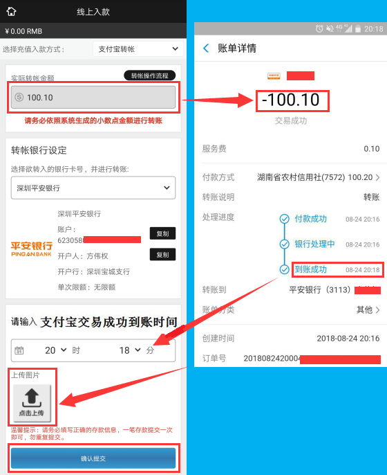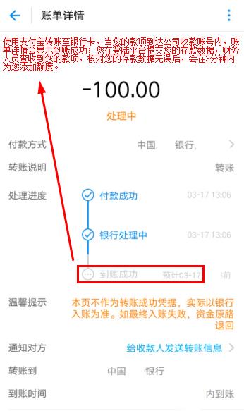 进入支付宝转账页面后,记录/复制好公司收款银行账户,登陆您的支付宝进行转账,且支付宝实际转账金额必须与页面显示(带有小数点)的金额一致。转账成功后,等待转账详情--显示到账成功。按照提示填写您的到账时间,并上传您的转账详情截图,在点击确认提交。(温馨提示:使用支付宝转账至平安银行是即时到账的;务必先确认到账后,填写准确到账时间,再点击提交,否则财务人员查询不到款项无法第一时间帮您添加额度。)